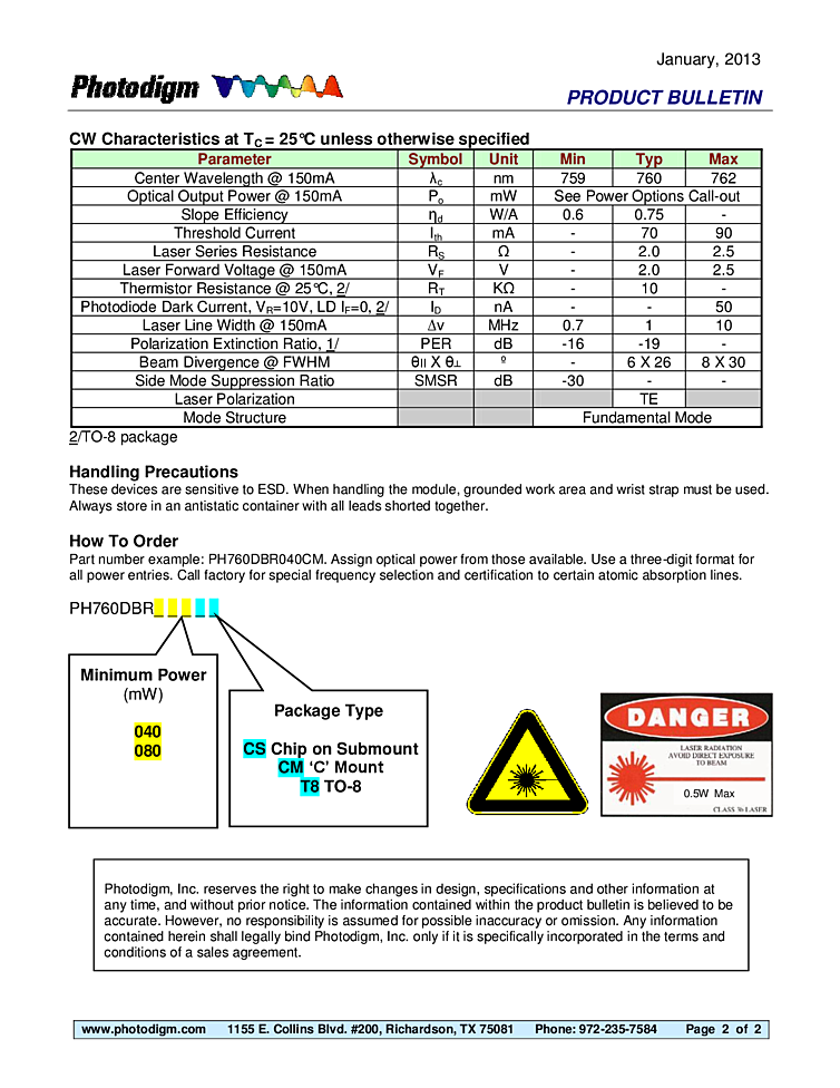 760nm PH760DBR Series High-Power Single-Frequency Laser Diode