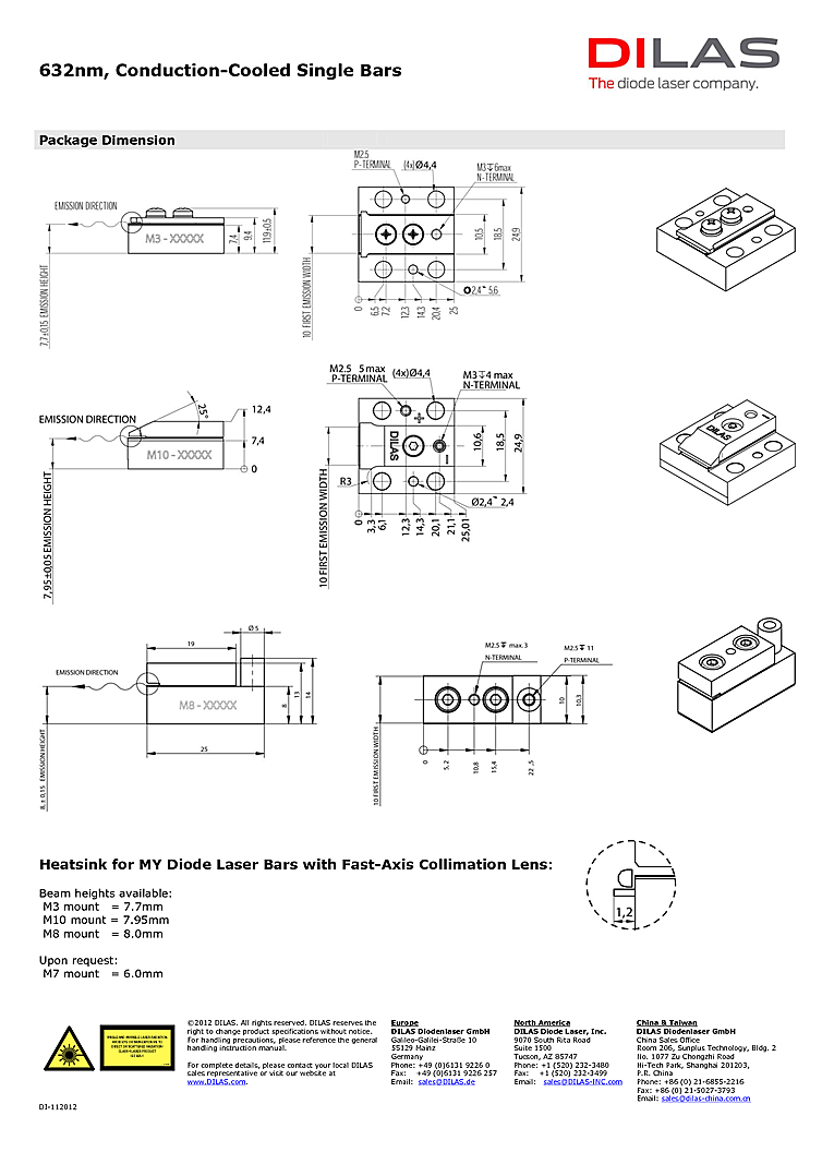 632nm DILAS diode laser is a Conduction-Cooled single bar device which lists the following features on the data sheet attached. These bars deliver very low smile and are available with fast-axis collimation. Also, different heatsink geometries are available.