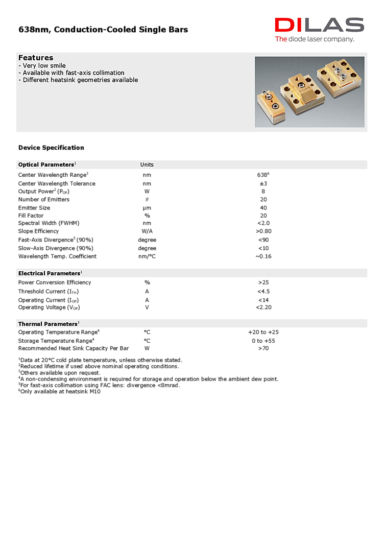 632nm High power bar laser diode with very low smile and available in 3 package types. Different package types allow for easy integration into laser systems. DILAS laser with output power up to 8 watts at a wavelength of 632nm.