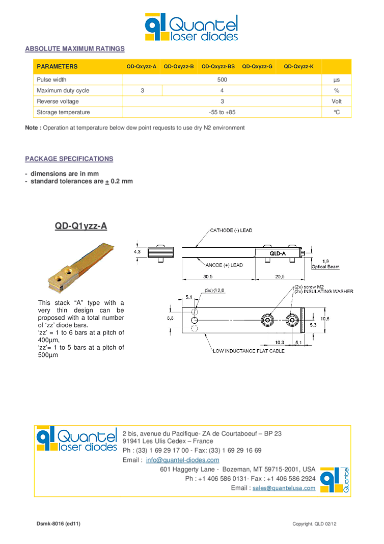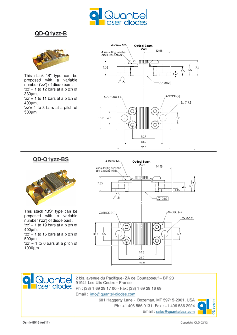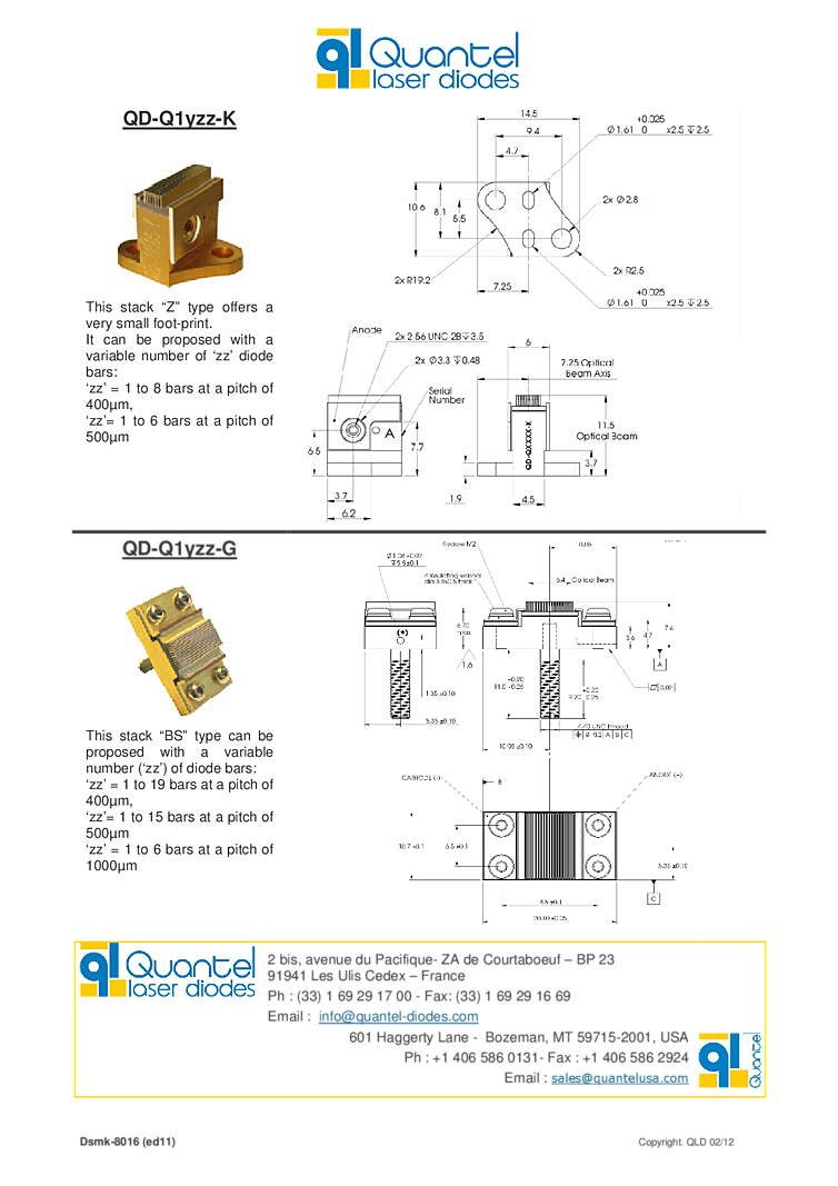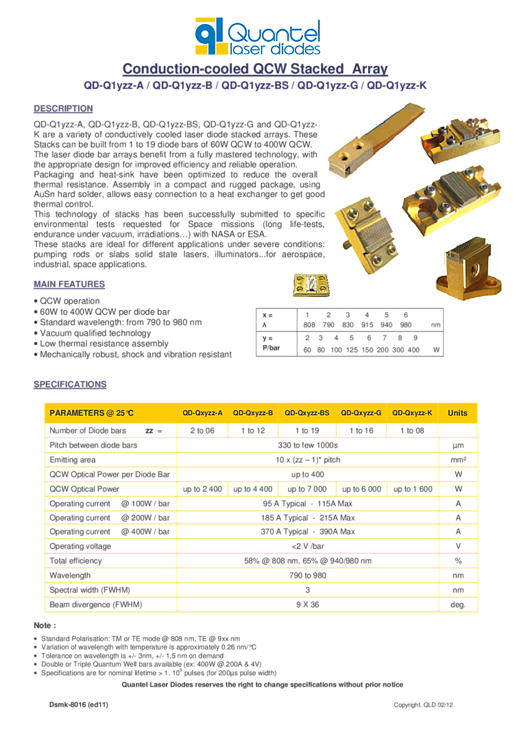 790nm, 980nm laser arrays - stacks offer 400W ouptup power. These lasers can be built from 1 to 19 diode bars of 60W QCW to 400W QCW. The laser diode bar arrays benefit from a fully mastered technology, with the appropriate design for improved efficiency and reliable operation. Packaging and heat-sink have been optimized to reduce the overall