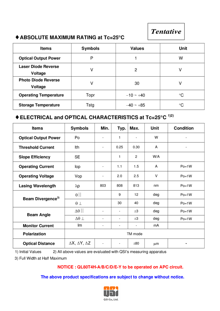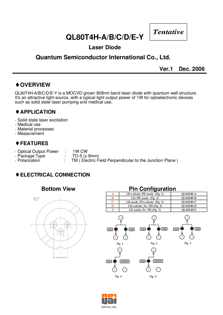 808nm QL80T4H-A/B/C/D/E-Y is a MOCVD grown band laser diode with quantum well structure. It's an attractive light source, with a typical light output power of 1W for optoelectronic devices such as solid state laser pumping and medical use.