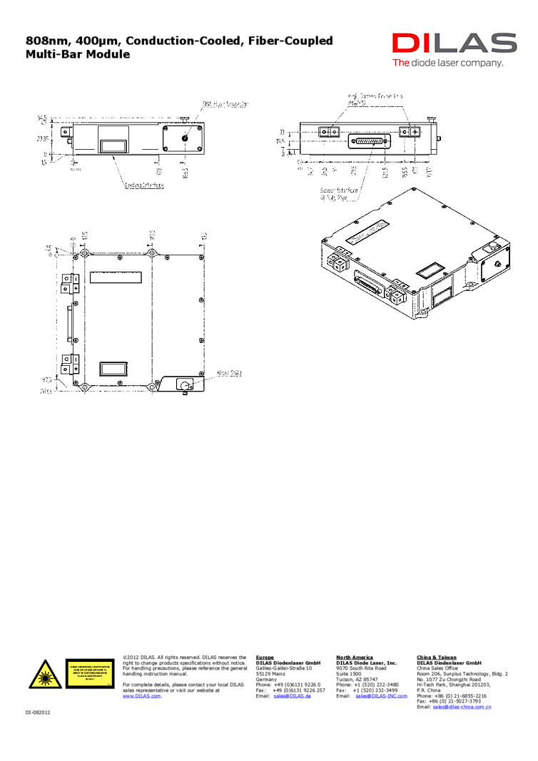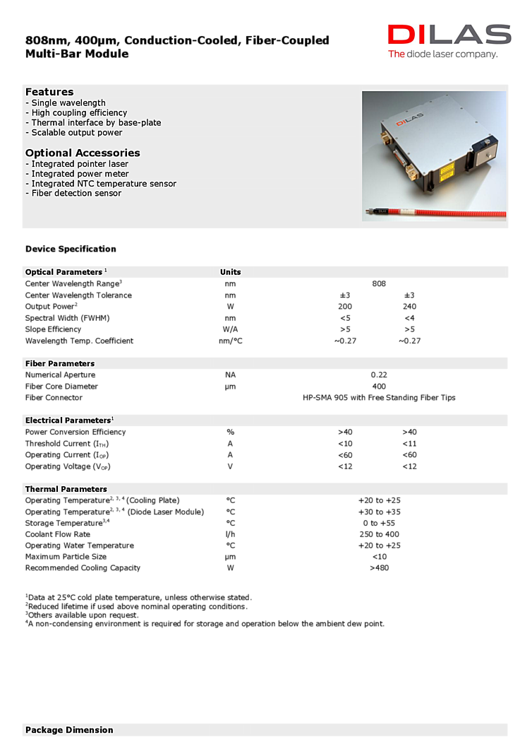 808nm This DILAS laser device offers a 400µm, Conduction-Cooled, Fiber-Coupled Multi-Bar Module. Key features include single wavelength and a high coupling efficiency. Also referenced in the spec. sheet are thermal interface by base-plate and scalable output power. Optional accessories include integrated pointer laser, integrated power meter and integrated NTC temperature sensor as well as fiber detection sensor.