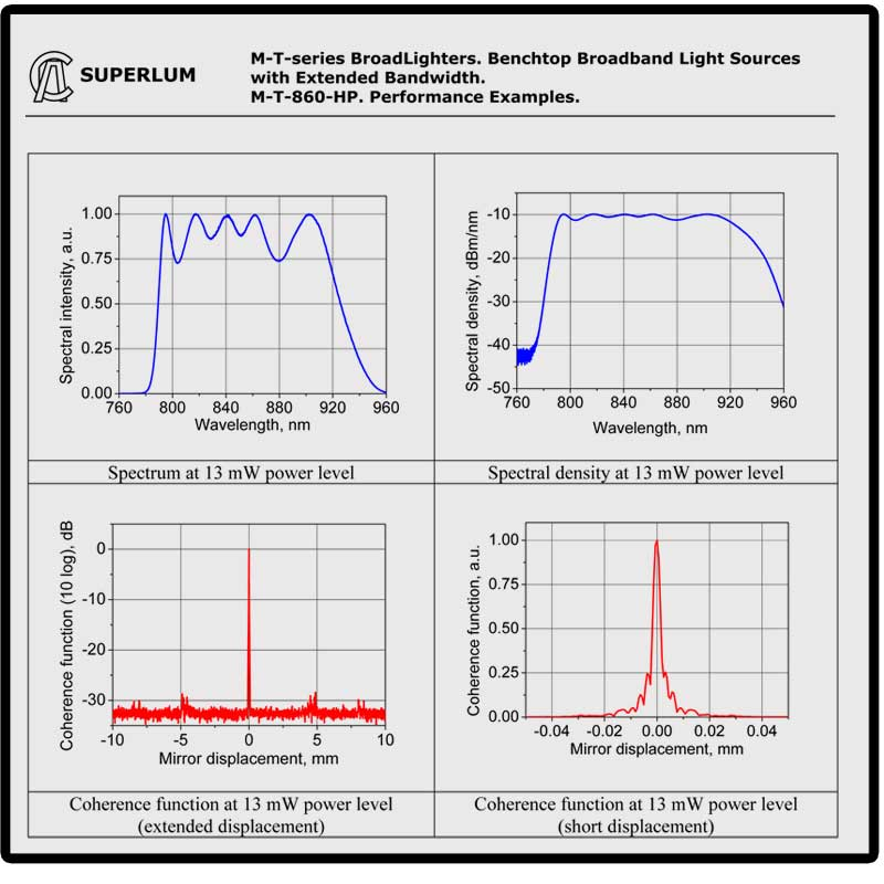These high power SLD broadband light sources from Superlum offer >12mW of optical power over a very wide spectrum. Additionally, they offer very low coherence length. These unites are based on a combination of spectrally shifted single mode fiber coupled SLED (superluminescent diode modules). They have multiple SLD's integrated and combined to offer high output power performance. These units can be operated through a fully featured front panel and control panel, or remotely through a USB interface.