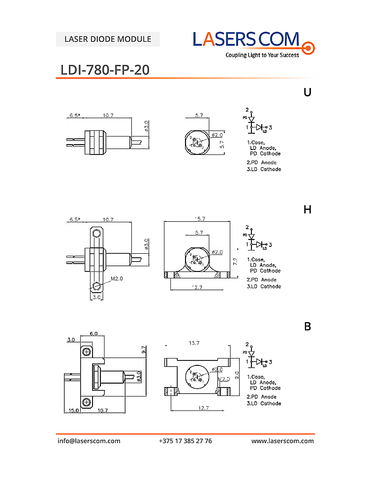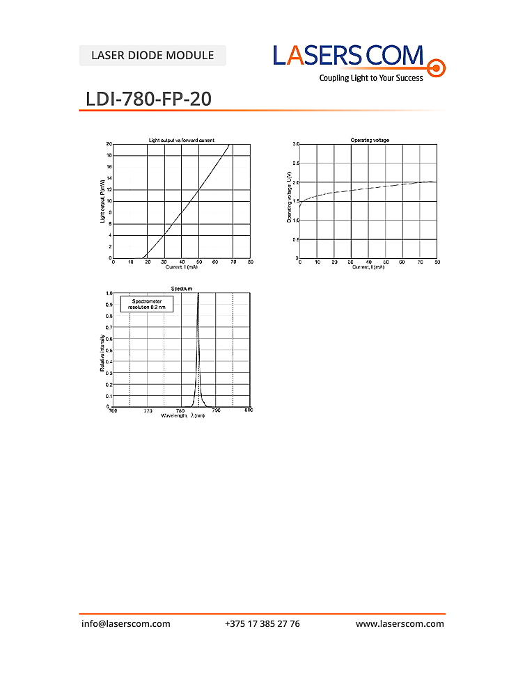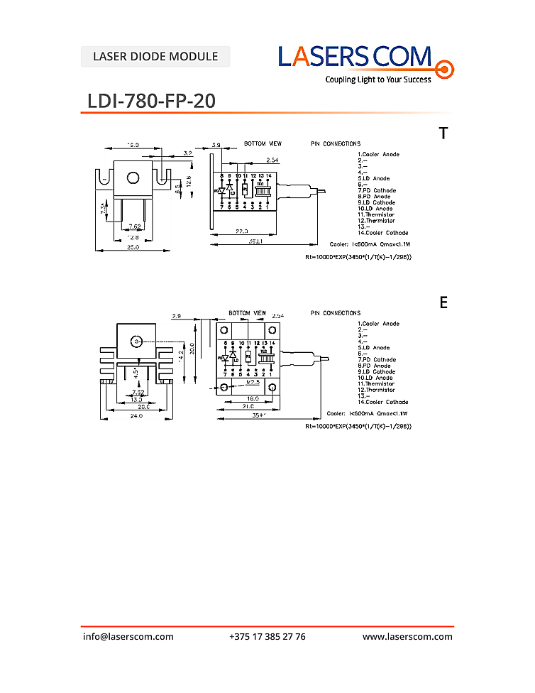 780nm Fabry-Perot laser diode in TO-can or DIL package from LasersCom. DIL package features a single-mode fiber, photodiode, thermistor, and TEC. The integrated photodiode allows for automated power control mode and TEC provides long term wavelength and optical power stability. Laser diode output power up to 20mW at a wavelength of 780nm.