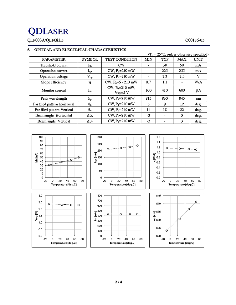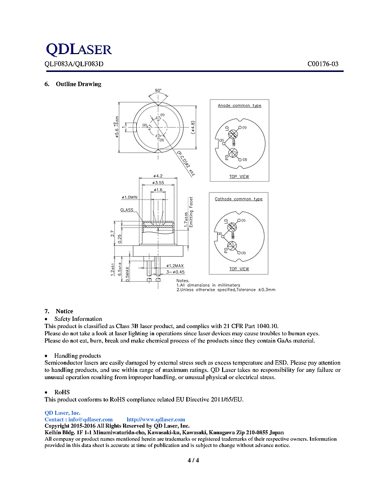 830nm laser diode from QD Laser. The QLF083x series is an 830 nm quantum well laser device designed for high output power application. The laser diode is mounted into a TO-56 header including a monitor PD and hermetic sealed with a flat glass cap.