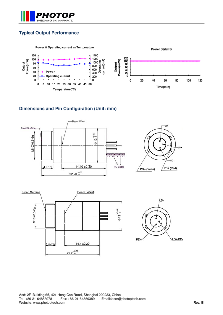 532nm Photop specifications for the 100mW laser incldue green laser diode working current of 1400 mA and a laser diode operating voltage of 2.1 Volts. This device is offered in a standard TO-can package.