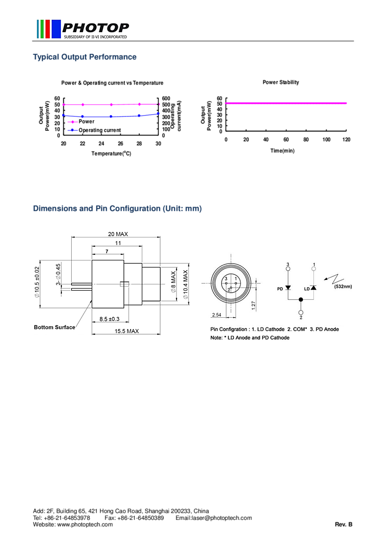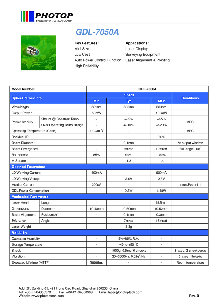 532nm Key Features of the attached Photop 125mW laser include auto power control function and high reliability. Primary applications include Laser Displays and Low Cost Surveying Equipment. Compact TO-can package is ideal of OEM applications.