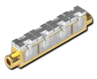 The Derringer package features a proprietary water cooling design that enables excellent heat extraction without the need for deionized water. The arrays are well-suited to side-pumping of solid-state laser (SSL) crystals, as well as any direct diode application which requires multiple bars in a linear configuration. The 4-long Derringer features an emission output length of approximately 4 cm. CW output powers of up to 160W are available. For QCW configurations, the maximum output is 9.6 kW out of a 32-bar array.