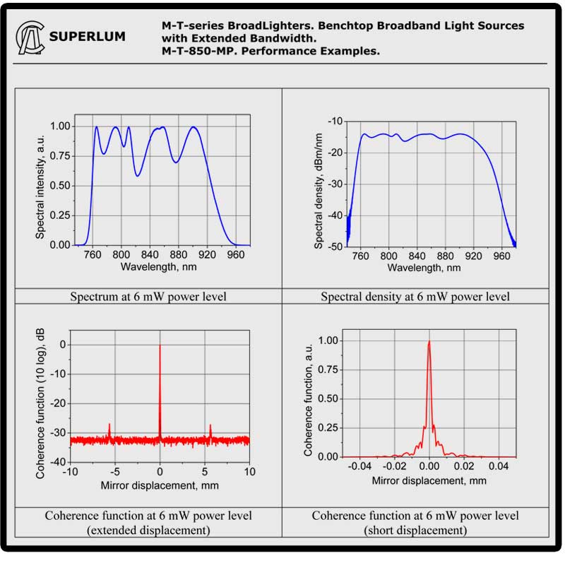 These 850nm SLED based broadband light sources from Superlum are extremely wide-spectrum, very low coherence length benchtop instrument sources. The M-series BroadLighter from Superlum is based on a combination of spectrally shifted single mode fiber coupled superluminescent diode modules (SLDs). These units have multiple SLD's integrated and combined to offer extended bandwidth and high output power performance. These units can be operated through a fully featured front panel, or remotely through a USB interface or TTL trigger function.