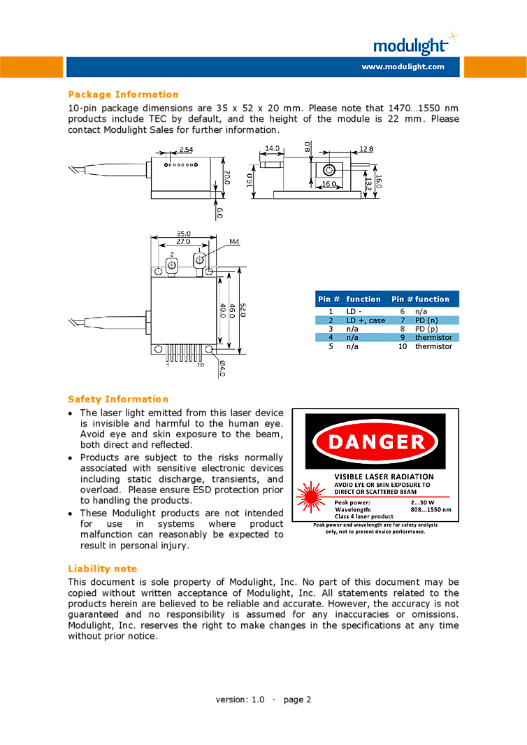 808nm, 976nm, 1470nm, 1550nm Modulight’s new addition to FiberLight laser series comprises of multi-chip diode laser modules in the wavelength range of 808…1550 nm. The package is robust and it has a small footprint of 35 x 52 mm and height of 20…22 mm. By default the output is a 200 µm NA=0.22 fiber pigtail. Also a receptacle type output is available per request. Optionally, a thermistor, a TEC-element, a photodiode, an aiming beam and a fiber detector can be added to the package.