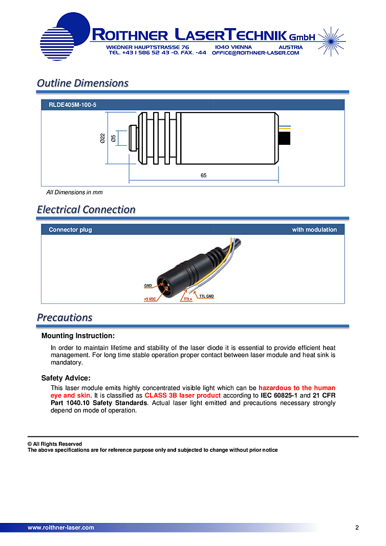 405nm laser diode module from Roithner LaserTechnik data sheet specifies that is has been designed with an emphasis on superior beam quality and reliable operation. The devices is made of black anodized alumuminum, enclosing the laser diode and the control electronics. Furthermore, this 405 nm device specicification document details a focusable glass lens optic with locking mechanism. There is an integrated 5V DC driver circuit and this diode laser can accept up to 20 KHz of TTL modulation. The optical output power is 100mW and the specified drive current is specified at 200mA maximum. The laser class is 3B and the operating voltage is specified at 5V (power supply).