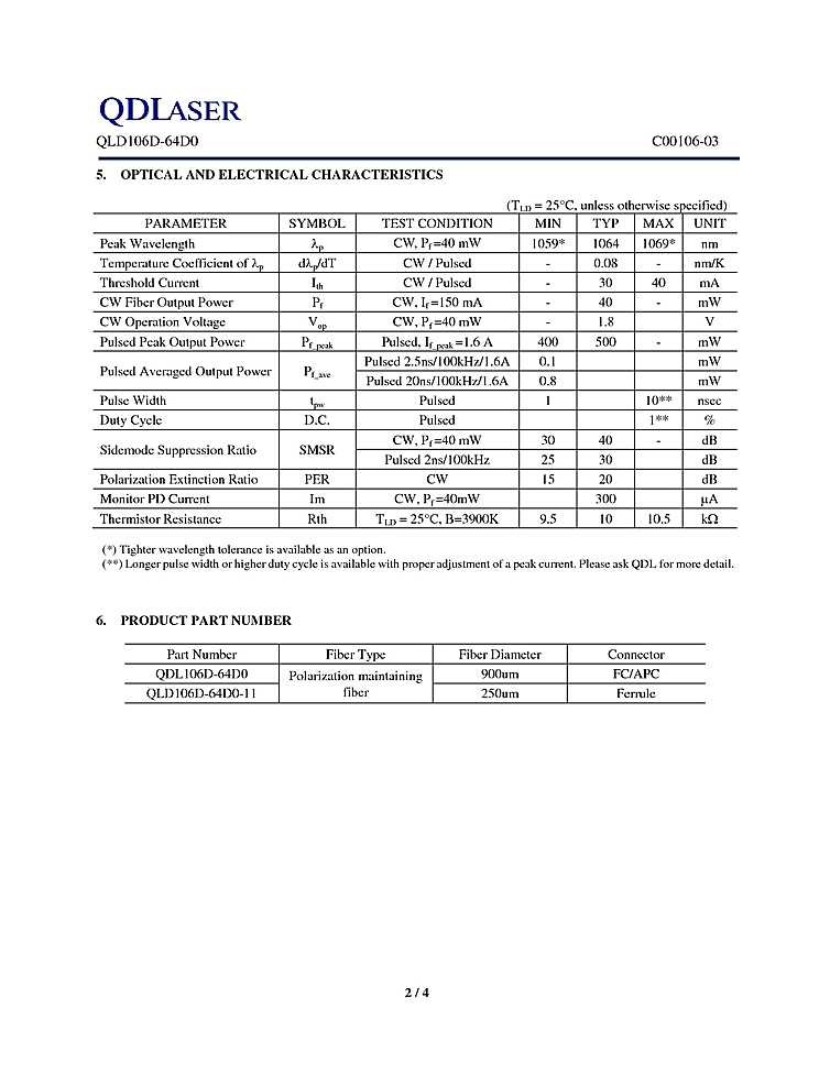 1064nm laser diode from QDLaser is a high power pulsed 1064nm distributed feedback (DFB) laser for use in seeder for fiber lasers and sensing applications. The laser is assembled into a 14-pin butterfly package with an optical isolator, a monitor PD and a thermo-electric cooler.