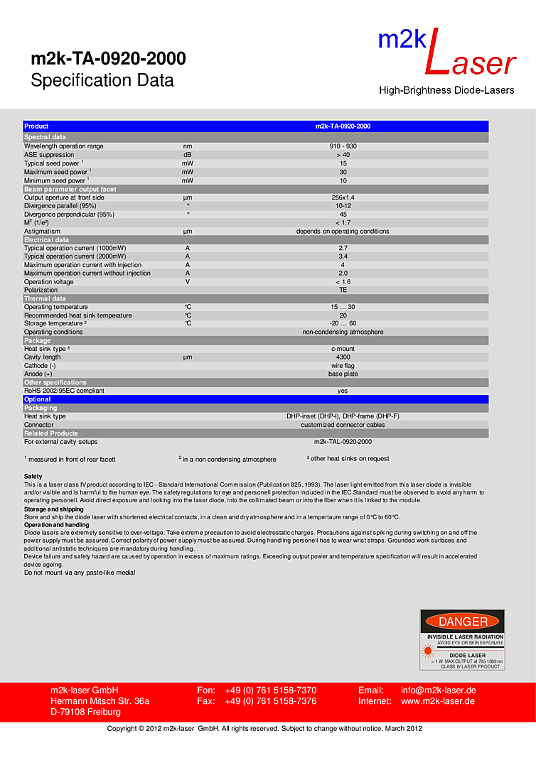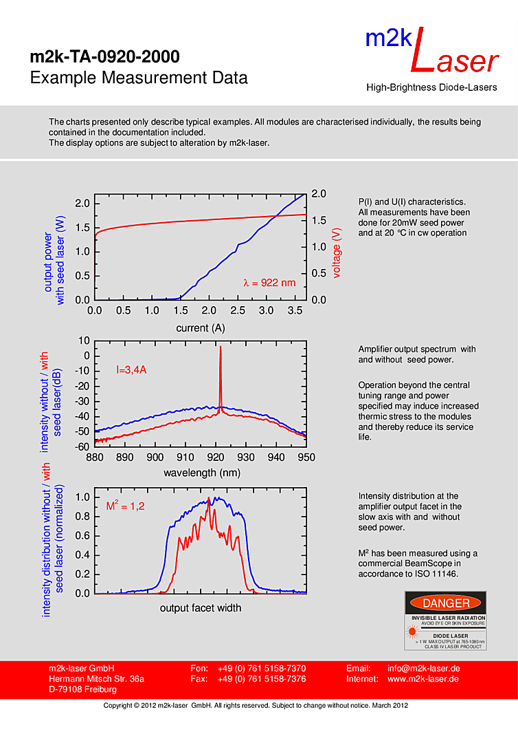 - The m2k-TA-0920-2000 is also available for external cavity configurations, see product data sheet m2k-TAL-0920-2000.