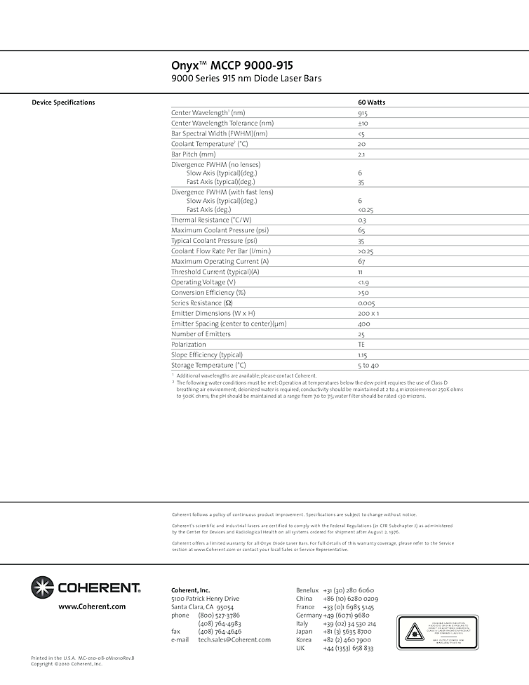 915nm Onyx MCCP 9000-915; 9000 Series Diode Laser Bars