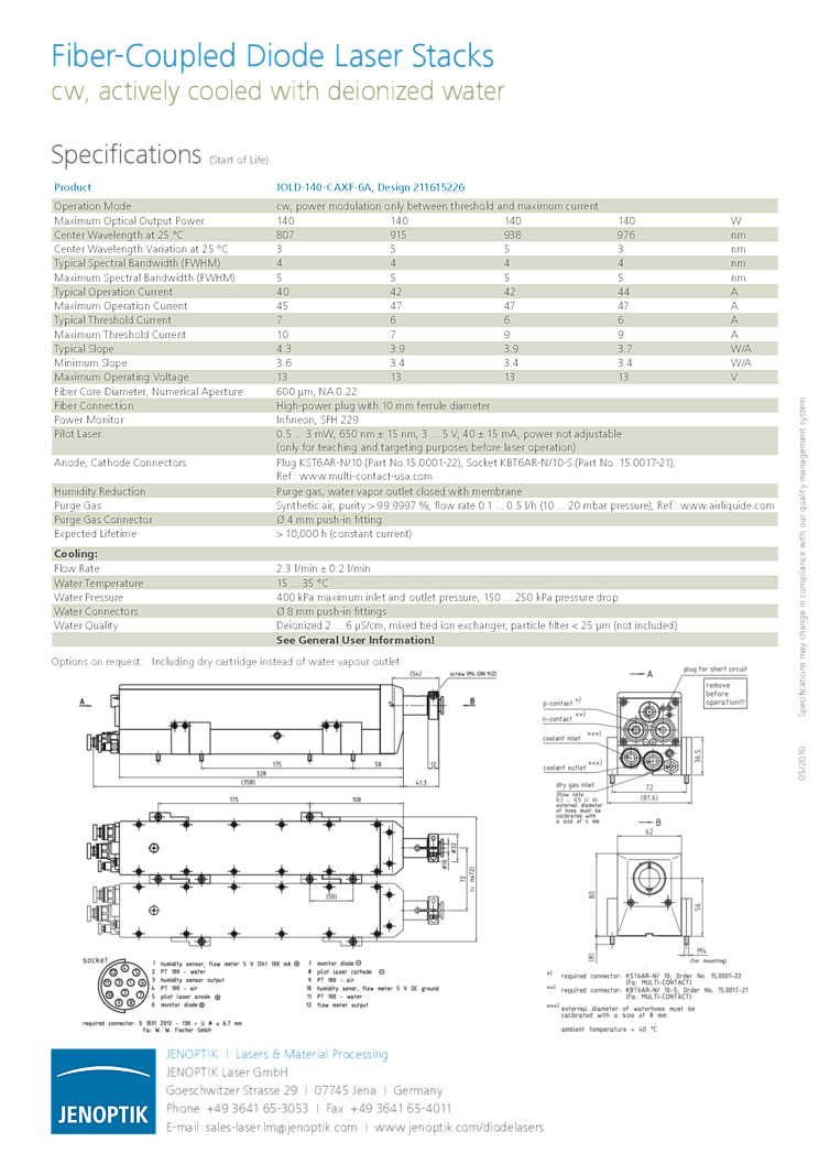 波長: 915nm-915nm 出力: 140W-140W パッケージ: fiber coupled stack テクノロジー: high power laser stack