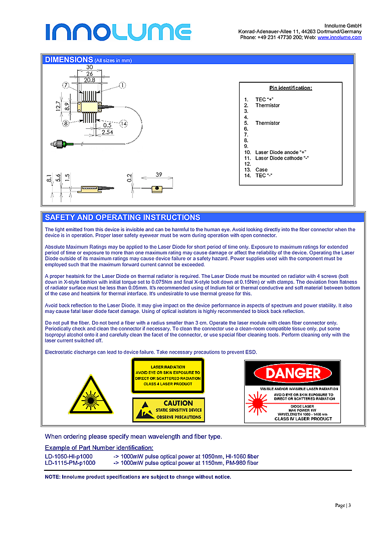 1020nm-1050nm laser diode features include high power optical pulses and any wavelength from 1030-1130nm range is available. Also, proprietary mirror coating technology enabling long life-time. Polarization maintaining fiber PM980 or HI1060 fiber on request. These devices are RoHS compliant. Applications include the seeding of fiber lasers as well as instrumentation / measurement equipment.