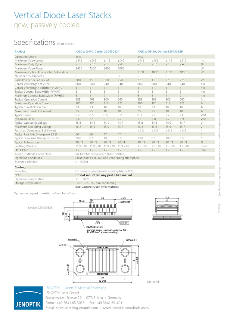 940nm Features of this JENOPTIK 2.4kW pump laser include high optical output power up to 300 W qcw per bar