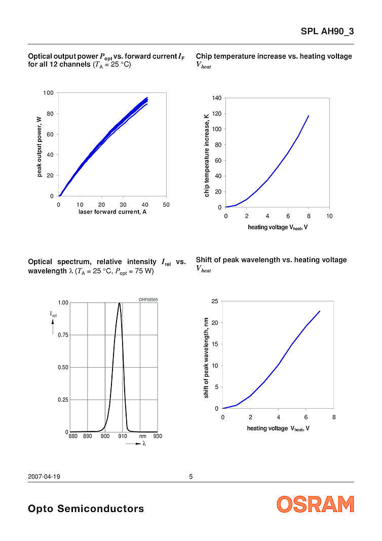 905nm Features of this Osram laser incldude: 12 individually addressable pulsed lasers, monolithic laser die with 260 μm channel pitch, aperture of each laser channel 200 μm × 10 μm, nanostack laser technology including multiple epitaxially stacked emitters. Also, optical peak power up to 75 W per laser at laser wavelength 905 nm. AR-coated glass window with integrated heater for wavelength stabilization and operating temperature range -40 to +105°C.