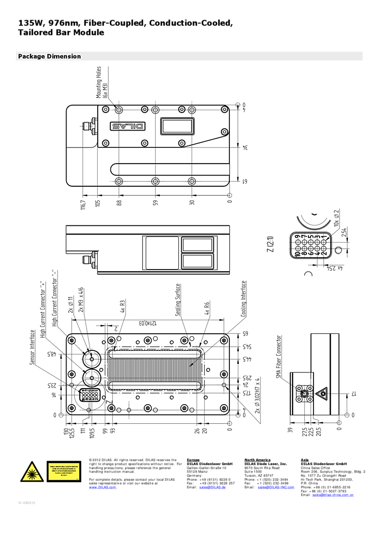 976nm Laser Diode, DILAS Diode Lasers offers the following features and specfications: 135Watts of optical output power, 976nm wavelength. This device is a fiber-coupled conduction-cooled package. This tailored bar module