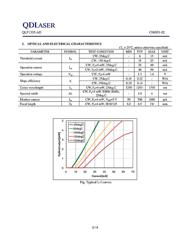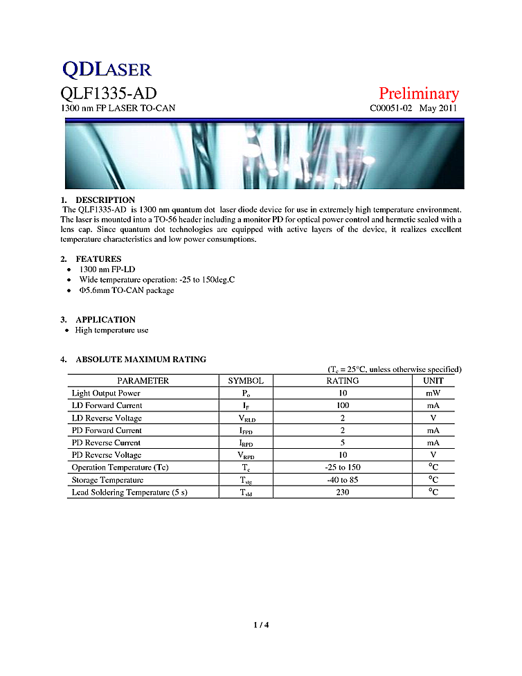 1300nm quantum dot laser is specified for use in extremely high temperature environment. The QDLaser device is mounted into a TO-56 header including a monitor PD for optical power control and hermetic sealed with a lens cap. Since quantum dot technologies are equipped with active layers of the device, they realize excellent temperature characteristics and low power consumption. Features of these 1300nm laser diodes include wide temperature operation fro: -25 to 150 degree Celsius.