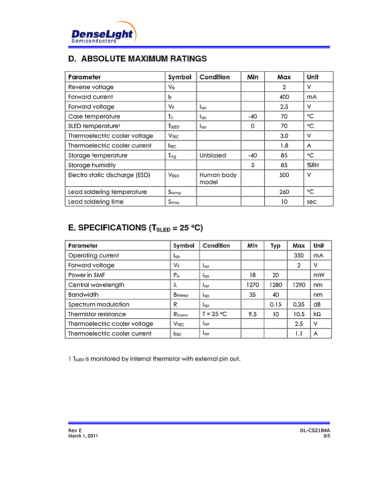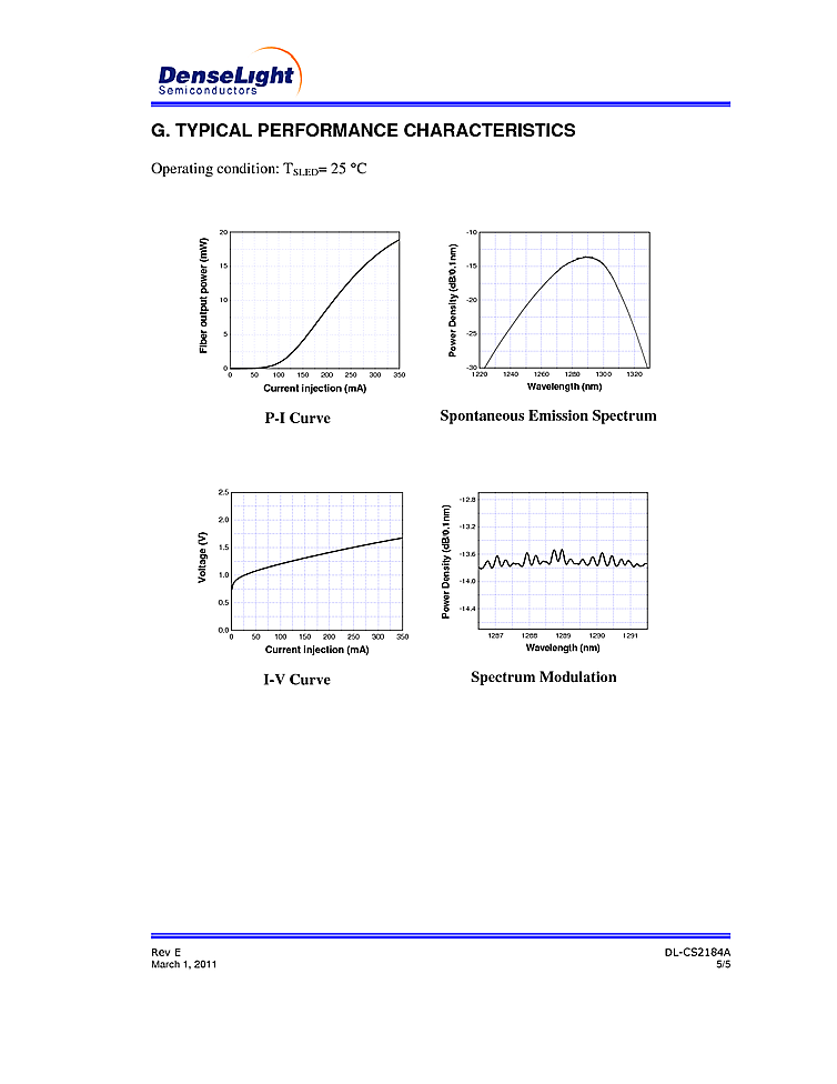 The DenseLight DL-CS2184A series is a broadband SLED that operates in a true inherent superluminescent mode. This superluminescent property generates broader band at higher drive currents in contrast to other conventional SLEDs which are ASE-based, where high drive tends to give narrower band. Its low coherence reduces Rayleigh backscattering noise. Coupled with high power and large spectral width, it offsets photoreceiver noise and improves spatial resolution (in OCT) and measurand sensitivity (in sensors). The SLED is available in 14-pin BTF package. It is compliance with the requirements of Telcordia GR-468-CORE. Enabled by DensePICTM spread spectra bandgap engineering technology, future generations of DenseLight SLEDs promise higher chip powers (up to 50mW possible), and broader spectral bands (beyond 120nm). Higher levels of integration may feature integrated SLEDs with phase modulators, optical couplers and photodetectors into a complete optical sensor chipset. For responsive prototyping enquiries please email: info@denselight.com