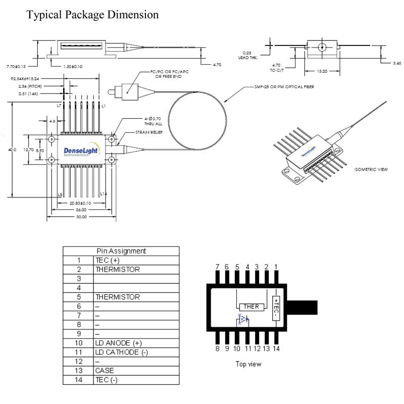These Denselight pulsed ultra-narrow linewidth laser diodes are offered in a butterfly package with SMF pigtail emitting at 1550nm. Key applications for these devices include use in OTDR's, use in optical measuring instruments as well as laser based gas and chemical sensing. This laser is based on an external cavity laser with built-in fiber Bragg grating, offering very stable performance of lasing wavelength, very narrow spectral linewidth and excellent SMSR.