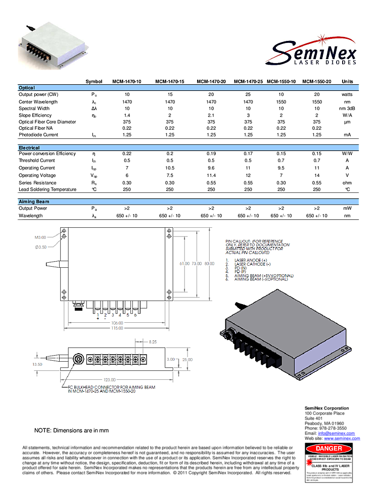 1470nm, 1532nm, 1550nm SemiNex delivers the highest available CW power at infrared wavelengths. SemiNex will optimize the design of its laser chips to meet customers’ optical and electrical performance specifications. Diodes are mounted and tested to meet custom applications.