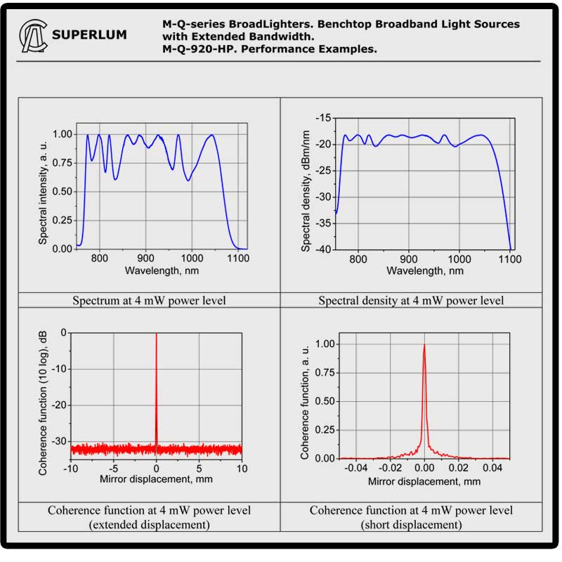 These high power SLD broadband light sources from Superlum offer >3mW of optical power over a very wide spectrum. Additionally, they offer very low coherence length. These unites are based on a combination of spectrally shifted single mode fiber coupled SLED (superluminescent diode modules). They have multiple SLD's integrated and combined to offer high output power performance. These units can be operated through a fully featured front panel and control panel, or remotely through a USB interface.