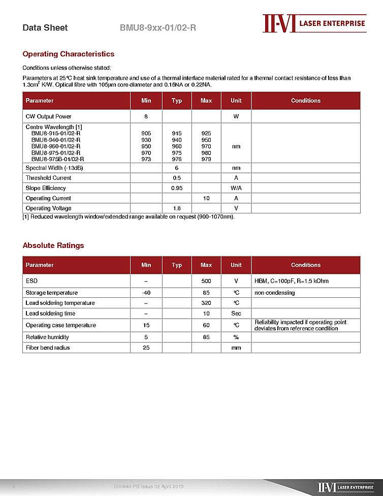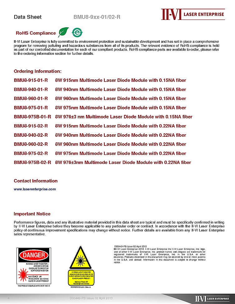 波長: 915nm-980nm 出力: 8W-8W パッケージ: 2 Pin Fiber Coupled Module