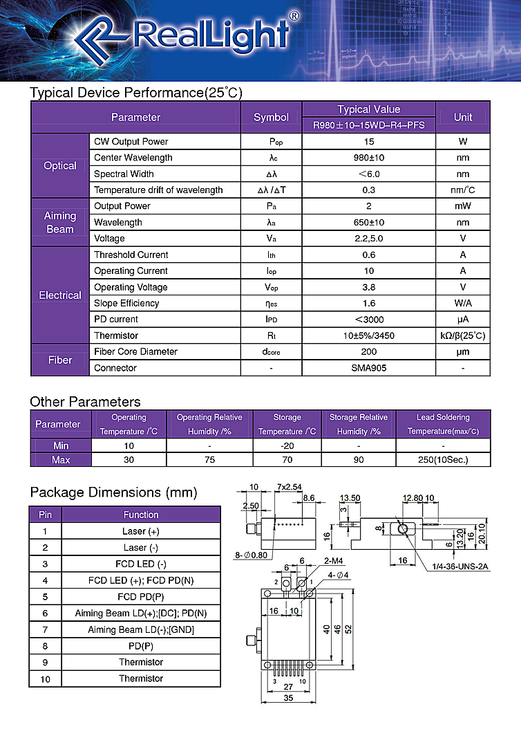 波長: 980nm-980nm 出力: 15W-15W パッケージ: Connectorized High Power Module テクノロジー: Multi-mode laser diode