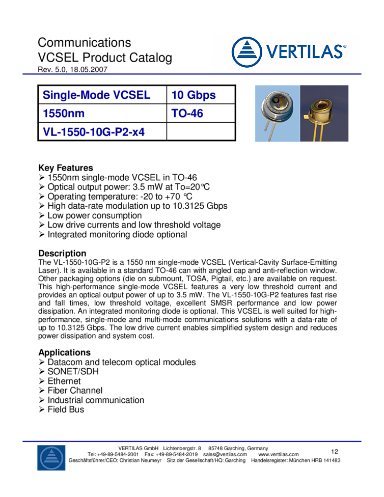 1550nm Vertilas telecommunication laser with the following key features Single-mode VCSEL, TO-46 form factor, 1 Gbps to 10 Gbps data rate product versions, Operating temperature: -20 to +70 °C, extended –20 to +85°C, Low power consumption: Sub 30 mW, Low drive currents and low threshold voltage and Integrated monitoring diode optional. Laser Diode VCSEL output power up to 1mW at a wavelength of 1550nm.