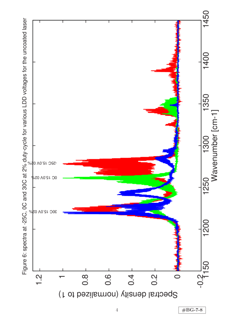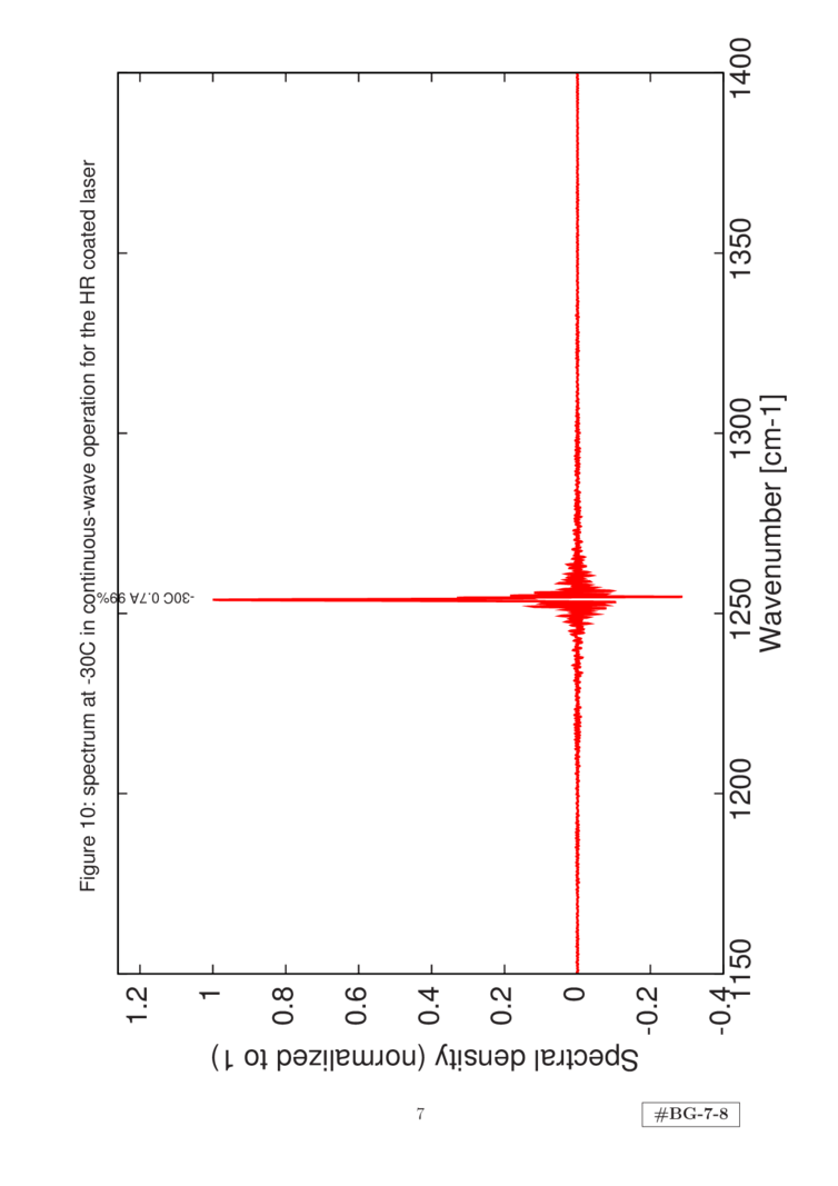 8403nm-7042nm The attached Alpes Laser QCL laser data sheet shows plots of spectral density versus wavenumber as well as LIV plots showing multiple different temperature performance levels. Wavenumbers on the attached data sheet are shown in inverse cm.