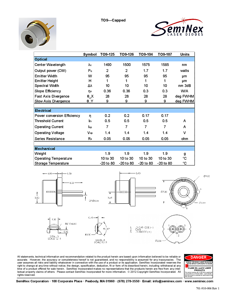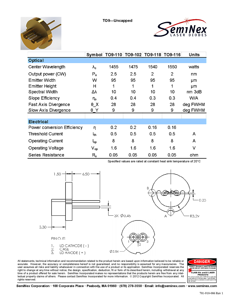 1550nm The Seminex Laser data sheet attached details the following specifications. Center wavelength of the laser is 1550 nm, output power (CW) is 2.5 Watts and the emitter Width is 95 µm.