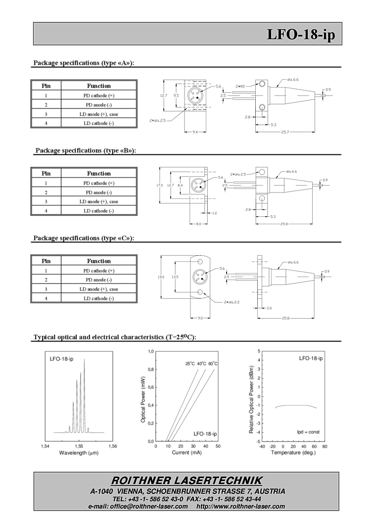 1530nm, 1570nm LFO-18-ip ñ is a series of optical modules based on Mitsubishi 1550nm MQW InGaAsP/InP Fabry-Perot laser diode and coupled with singlemode optical fiber. Hermetically sealed modules are performed in standard coaxial package with built-in InGaAs monitor photodiode and collimating ball lens.
