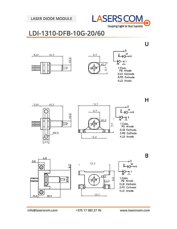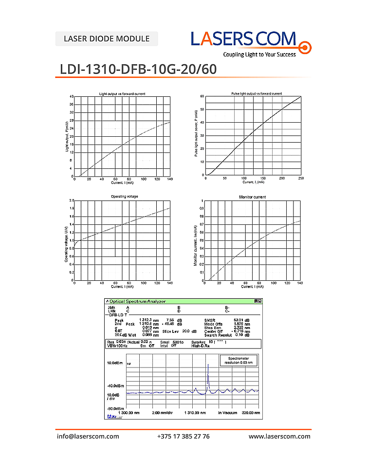 1310nm Diode laser from LaserCom designed for applications in fiber optic communication systems with speeds up to 10Gbps. DFB laser housed in TO-can or DIL package. Typical spectral width is 0.9nm. Pulse rise and fall times are less then 0.5ns. DFB laser diode output power up to 20mW at a wavelength of 1310nm.