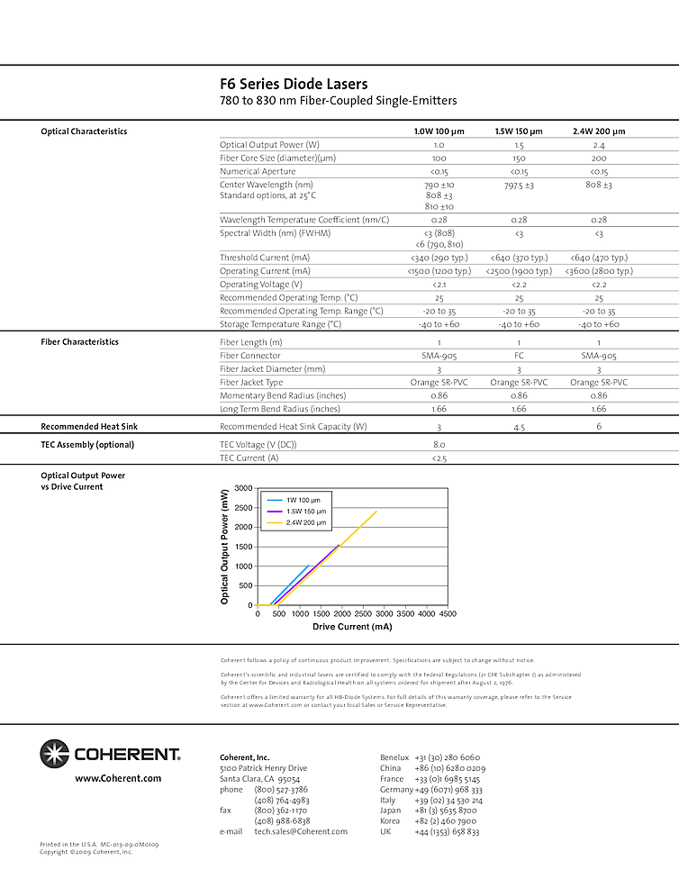 波長: 790nm-808nm 出力: 2400mW-2400mW パッケージ: F6, fiber coupled array テクノロジー: high powered laser array