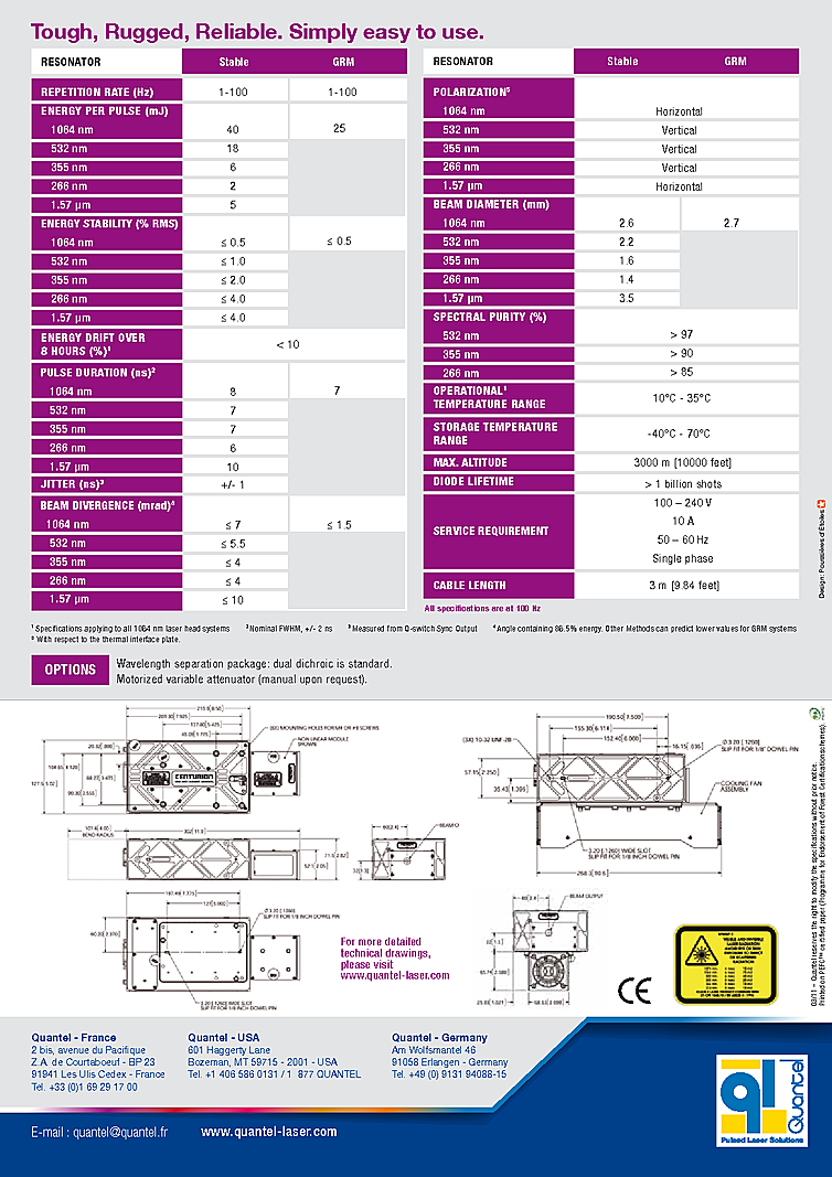 Nd YAG laser form Quantel with nanosecond pulse output and high peak output powers. Nanosecond laser was designed for low maintenance in industrial applications by using long lifetime laser diodes, nitrosealed, and air cooled. Laser system is controlled by a graphical user interface for fast setup. The compact design makes it ideal for customer integration into industrial or laboratory environments. Nd:YAG laser with output energy up to 40mJ at a wavelength of 1064nm.