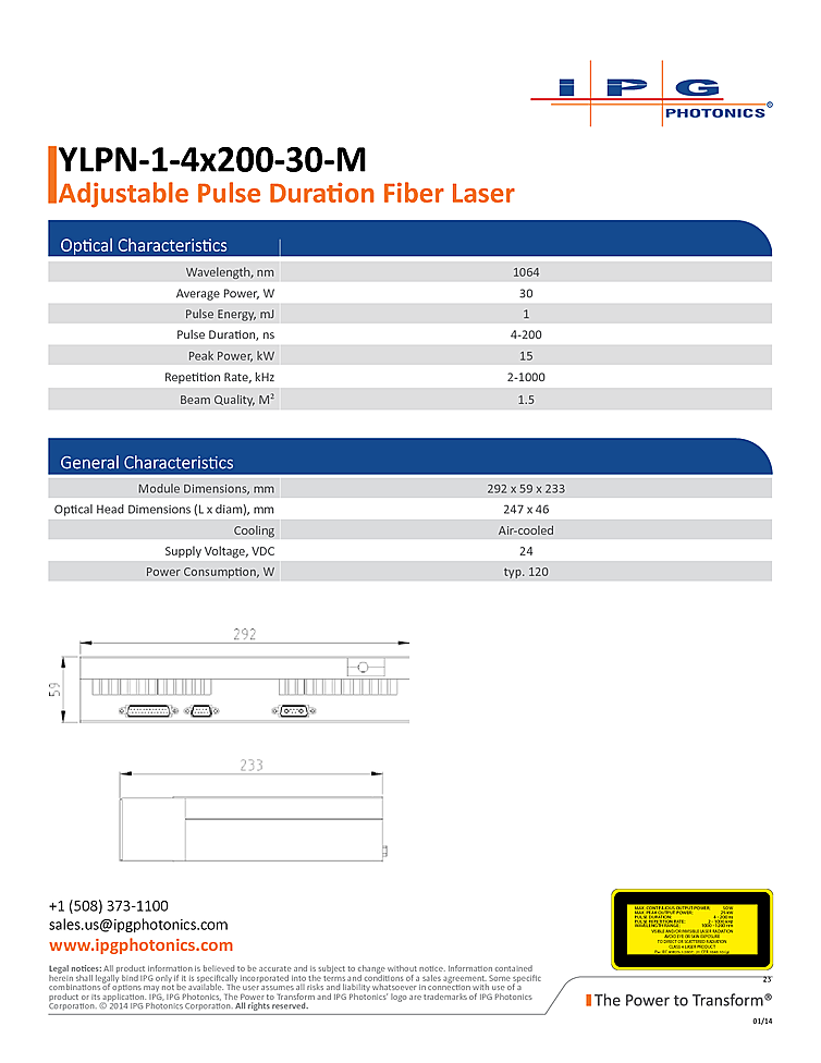 Fiber laser with adjustable pulse duration from IPG Photonics. The nanosecond laser was designed for applications in Precision Marking, Trimming, Coating removal, Scribing, Surface Treatment, Texturing and Cutting. Key features of the IPG Photonics fiber laser are Pulse Energy up to 1 mJ, Average Power up to 30 Watts, Pulse Repetition Rates 2-1000 kHz, Over 20% Wall-plug Efficiency, Instant Modulation Response, Excellent Pointing Stability, Maintenance-free Operation, and Full Flexibility in Operating Parameters. Nanosecond fiber laser is a small air-cooled maintenance-free module designed for OEM applications. Fiber laser output wavelength is 1064nm with pulse energy up to 1mJ.