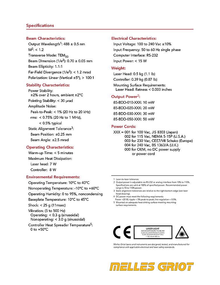 Melles Griot compact diode pumped solid state laser features high stability, excellent beam quality M2<1.2, and long life times. Designed for a wide variety of uses in the laboratory and the low power consumption makes it ideal for integration into laser systems. DPSS laser has optional modulation. CW Laser output power up to 50 mW at a wavelength of 488nm.