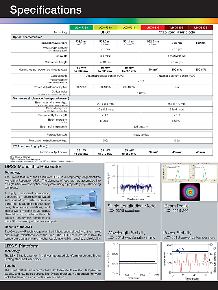 Applications for the 532nm laser include Raman Spectroscopy, Brillouin Scattering, Interferometry, Photoluminescence, Holography, Laser Doppler Velocimetry, Laser Ultrasonic and Dynamic Light Scattering. Key features of the CW laser include Single Longitudinal mode, Beam pointing ≤ 5 μm/°C, fiber coupled options, Controllers integrated into laser head and Industry standard footprint (100 x 40 mm^2). Computer interface is USB and RS-232 and includes a graphic user Interface with remote diagnostics. CW Laser from Oxxius has an output of 500mW at a wavelength of 532nm.