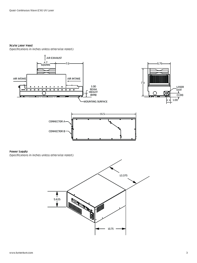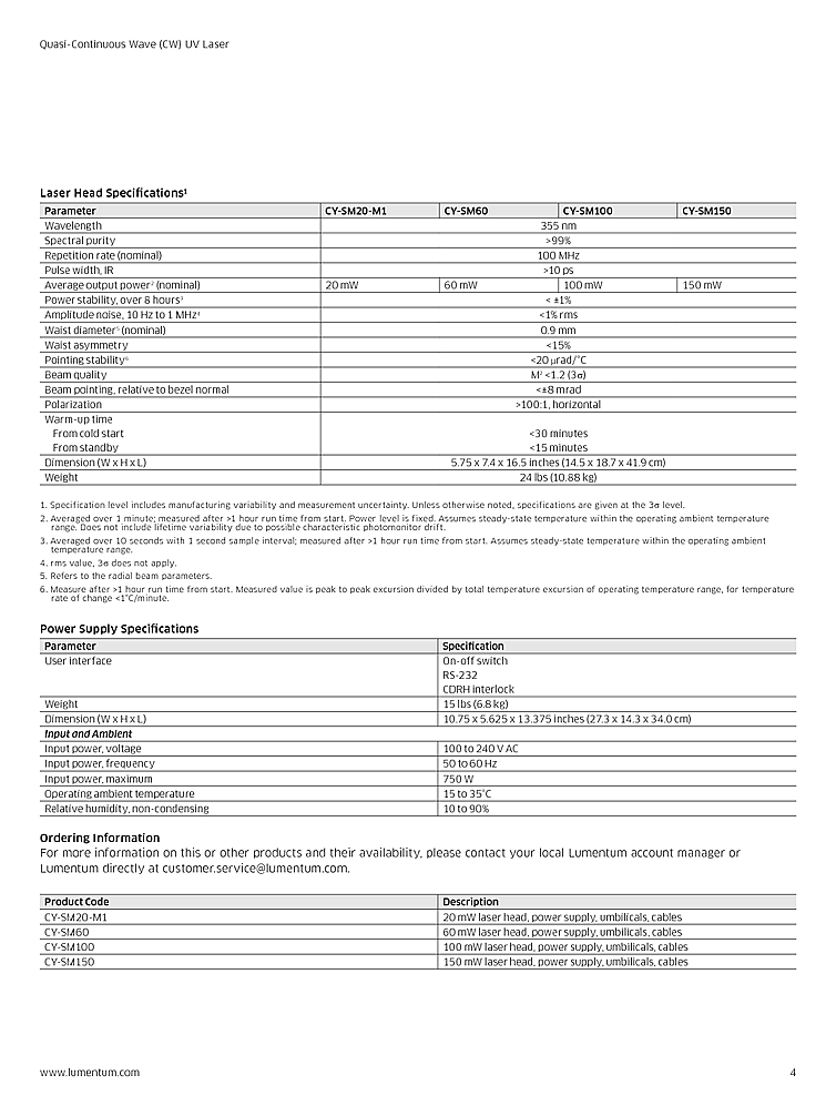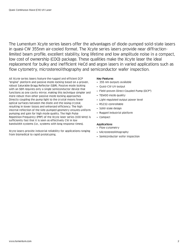 Lumentum QCW UV laser designed for industrial integration and features a proven all solid state laser design. Efficient design only requires air-cooling with average output power up to 150mW. Compact UV laser with output wavelength of 355 nm.