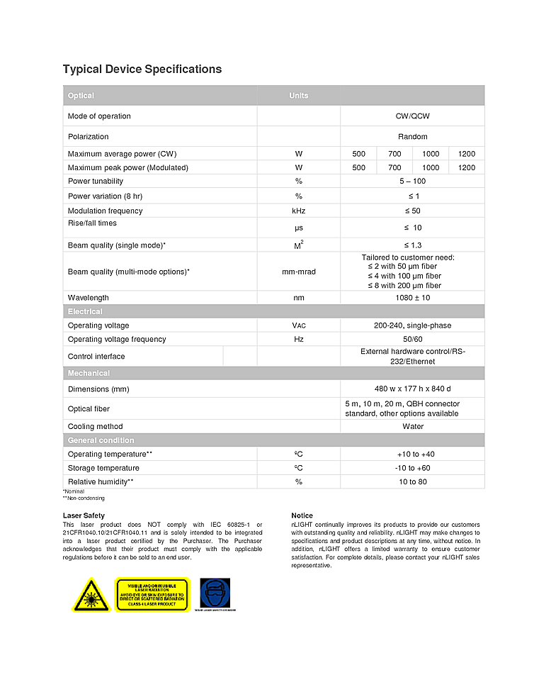 Fiber laser from nLight has the following key features advanced cutting and welding performance, fail-safe processing of highly reflective materials, proprietary design for high uptime and easy service, and durable design for harsh environmental conditions. CW fiber laser was designed for applications including Cutting, Welding and Drilling. Laser ouptut is CW and Quasi-CW with modulation frequencies up to 50kHz, rise/fall times of less then 10µs, and peak power up to 1200 watts. Fiber laser output is 1080nm with CW output power up to 1000 watts.