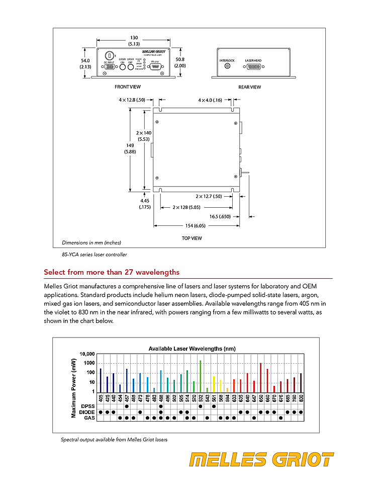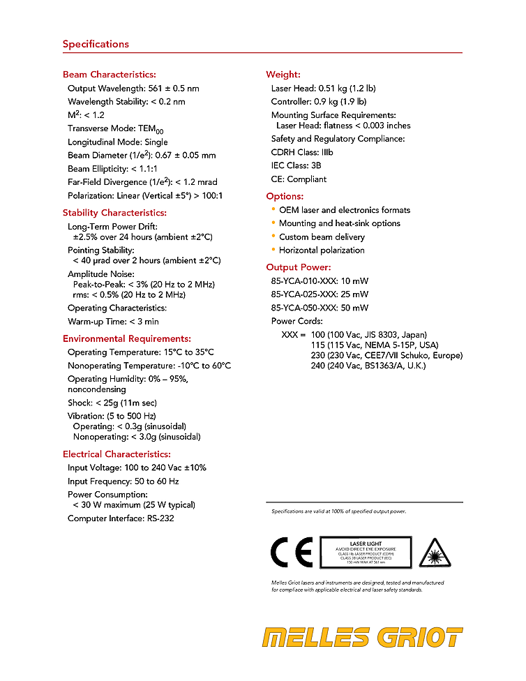 Diode pump solid state laser from Melles Griot. CW laser has a single transverse and longitudinal mode wit beam quality of M2<1.2. The all solid state laser was designed to be lightweight and compact and is a retrofit for krypton ion lasers with a drop in beam diameter of 0.67mm. For remote operation the laser has a RS-232 computer interface. Careful attention to design of hte laser allows for low noise operation with RMS noise less then 0.5% and peak to peak noise less then 3% over a frequency bandwidth of 20Hz to 2MHz. CW laser has output power up to 50 mW at a wavelength of 561 nm.