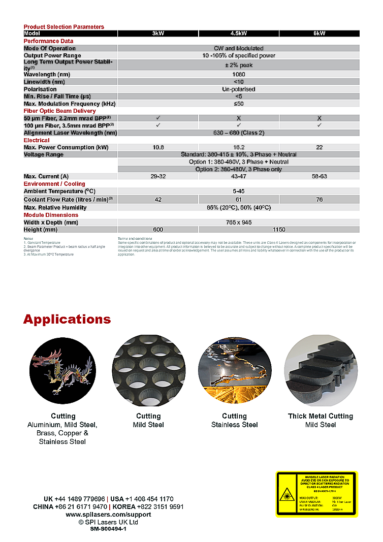 Designed for OEM integration into High Speed Cutting, Thick Section Welding, Cladding and Flat Sheet Cutting applications. High power Fiber laser with patented back reflection protection. Easy control integration into factory environments and designed for low energy consumption. Continuous wave or quasi-CW fiber laser operation. Excellent beam quality and designed for long term operation and reliability. Integrated pulse shaping and 50 kHz pulse output. Fiber laser output power up to 6000 watts at a wavelength of 1800nm.