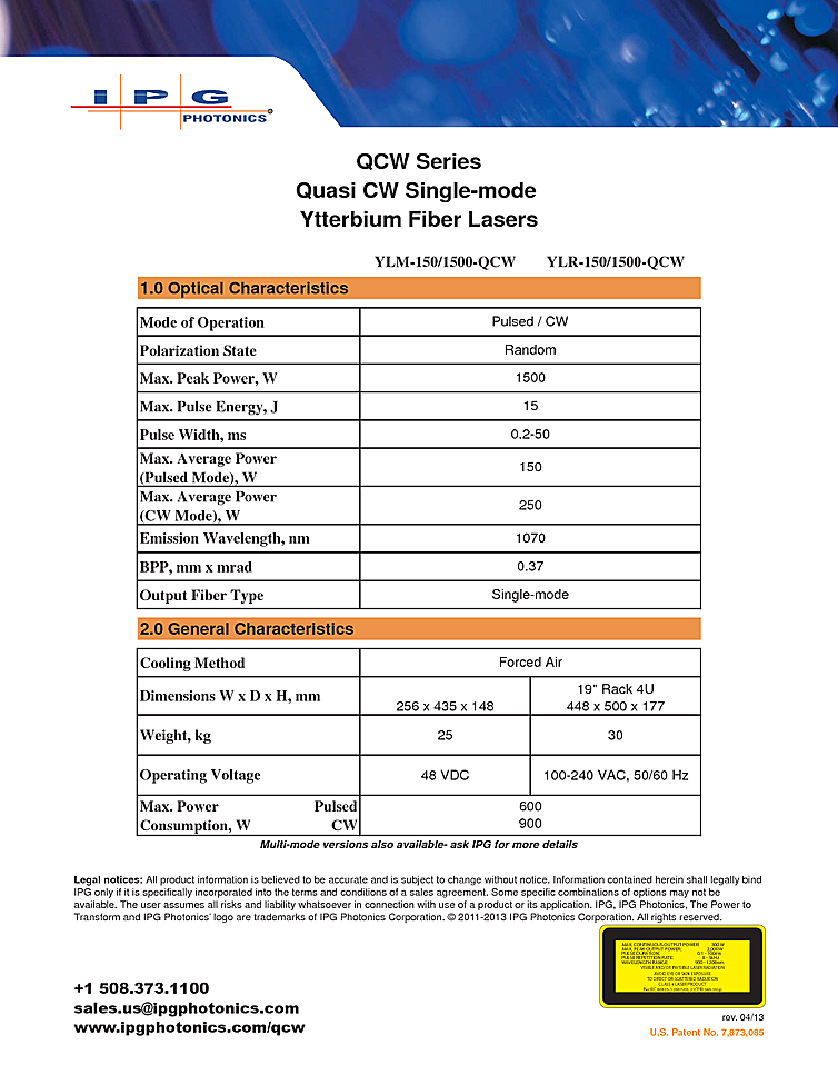 IPG Photonics fiber laser was designed for application including Spot Welding, Seam Welding, Microwelding, Drilling, Cutting, and Medical Devices. The fiber laser is a replacement for lamp-pumped lasers by providing greater then 30% wall-plug efficiency is a low cost, compact solution offering high peak power. High beam quality of M2<1.05 and outstanding pulse power and energy stability. Fiber laser features an internal pulse generator and allows for pulse shaping. In Quasi-CW mode the fiber laser pulse width is 0.2ms to 50ms with peak output power of 1500 watts or 15J of peak energy. Fiber laser wavelength is 1070nm with average output power of 250 watts.