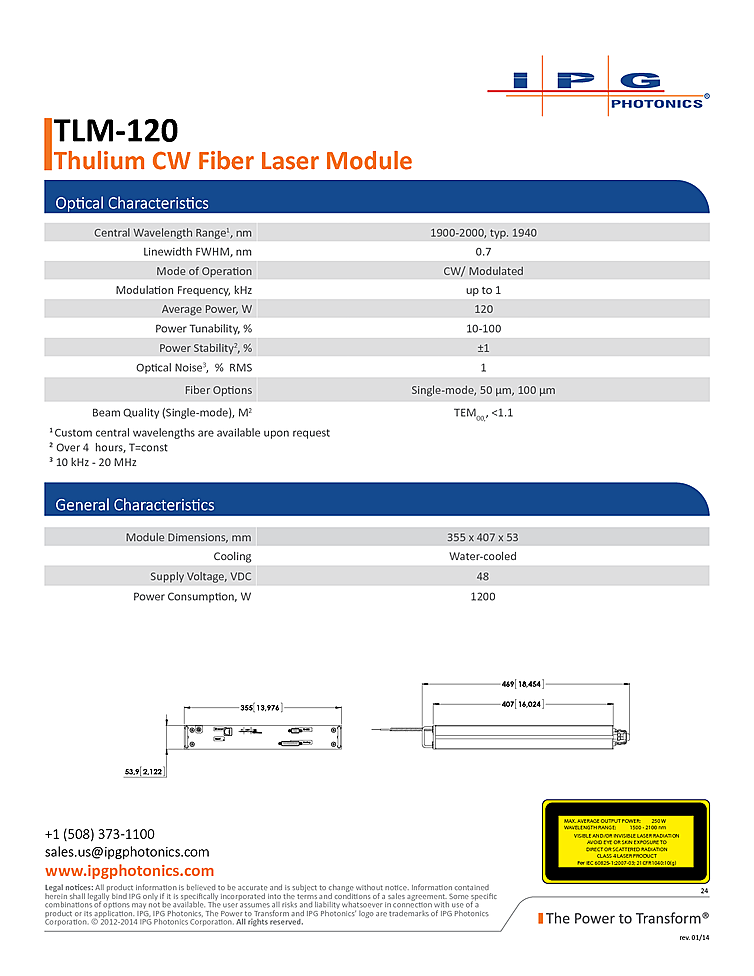 Fiber laser with CW output from IPG Photonics. CW Laser features a compact size, high wall-plug efficiency, cost effective price, and designed for OEM integration into customer applications. Fiber laser beam quality is M2<1.1 for the single-mode version other fiber options are 50 μm and 100 μm. The laser was designed for applications in Medical Treatment or Surgery, Plastic Materials Processing, Other Non-metal Materials Processing, Solid State IR Laser Pumping and Pollution Control. Laser can be operated in CW or Quasi-CW mode. In Quasi-CW operation the laser can be modulated up to 1kHz. Laser power can be adjusted from 10-100% of output power. Fiber laser output is 120 watts at a wavelength of 1940nm.