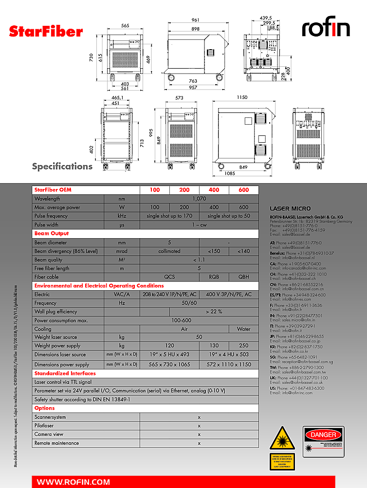 Fiber laser with CW output from Rofin. Key features of the laser include analogue power control, high efficiency, smallest spot size, safety features (industrial standard) and convenient operator control. CW Laser can also be operated in Quasi-CW with pulse repetition rate up to 50kHz and pulse duration of 1µs. The fiber laser can be controlled via TTL signal and parameters are set via 24V. Remote communication via Ethernet or anlog input. Options for the fiber laser include Scanner system, Pilot laser, Camera view or Remote maintenance. FIber laser output is up to 600 watts at a wavelength of 1070nm.