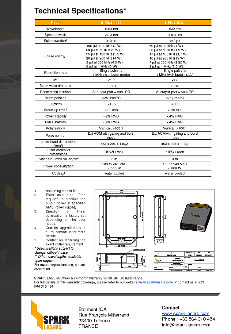 Picosecond laser with high energy output from Sparks Laser. Compact high energy laser is ideally suited for industrial applications such as thin film removal, glass engraving, or drilling/cutting in markets including Consumer Electronics, Automotive/Aerospace, Food industry, PV cells, and Medical & Bio-Medical. Low cost laser features a 24 month worldwide warranty is maintenance free. Picosecond laser includes a rugged plug-and-play design. Pulse repetition rate from single shot to 1MHz with a pulse duration less then 10ps. Picosecond laser pulse energy up to 50µJ at 20kHz and wavelength of 532nm.