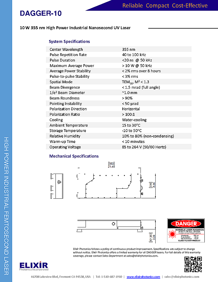 Elixir Photonics high power laser with nanosecond pulse output. Nanosecond laser was designed for applications in Flex circuit cutting and machining; microvia drilling of printed circuit boards; thin film metal cutting, patterning, marking and machining; LED processing and production; Si wafer scribing, cutting and dicing; and Indium-Tin Oxide (ITO) removal and patterning on glass and plastic. Key features of the laser include compact design, TEM00 with M2<1.3, and assembled in 1000 class clean room. Remote operation is possible with RS-232 interface and external GATE control. Nanosecond laser repetition rate of 40kHz to 100kHz with pulse width less then 20 ns at 50 kHz. Pulse energy great then 200 µJ at 50 kHz and wavelength of 355nm.