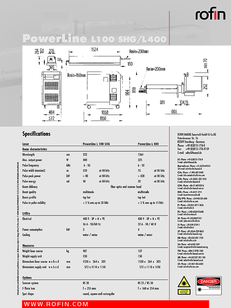 Nd:YAG Laser with nanosecond pulse output from Rofin. Nanosecond laser features high-speed processing, easy integration ROFIN control unit, high precision scanner system, and fiber beam delivery. Top hat beam profile with multi-mode beam quality. Fiber laser pulse output has a pulse repetition rate of 6kHz to 50kHz with pulse duration of 70ns and pulse to pulse stability of less then 3% at 15kHz. Peak pulse power is up to 420 kwatts at 10kHz. Average output power is 325 watts. Fiber laser wavelength is 1064nm with output energy of 30mJ.